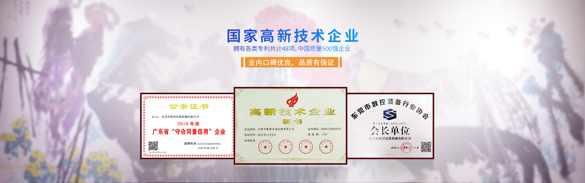 新望機(jī)械成立于1998年,位于東莞市東部工業(yè)園區(qū)的中心地帶——企石鎮(zhèn)東平村,交通方便、環(huán)境優(yōu)美舒適、視野開闊。公司注冊(cè)資本2000萬元,擁有辦公室、廠房等18,000多平方米。已通過ISO9001:2015國際質(zhì)量管理體系認(rèn)證,擁有國家各類專利共計(jì)58項(xiàng)。是東莞市企石鎮(zhèn)工商聯(lián)副會(huì)長單位、東莞市企石鎮(zhèn)文學(xué)藝術(shù)界聯(lián)合會(huì)副主席單位、東莞市環(huán)保包裝行業(yè)協(xié)會(huì)副會(huì)長單位、東莞市數(shù)控裝備行業(yè)協(xié)會(huì)第二屆會(huì)長單位、廣東省包裝技術(shù)協(xié)會(huì)常務(wù)理事單位、廣東省膠粘劑行業(yè)協(xié)會(huì)理事單位、廣東省著名商標(biāo)企業(yè)、國家高新技術(shù)企業(yè)。